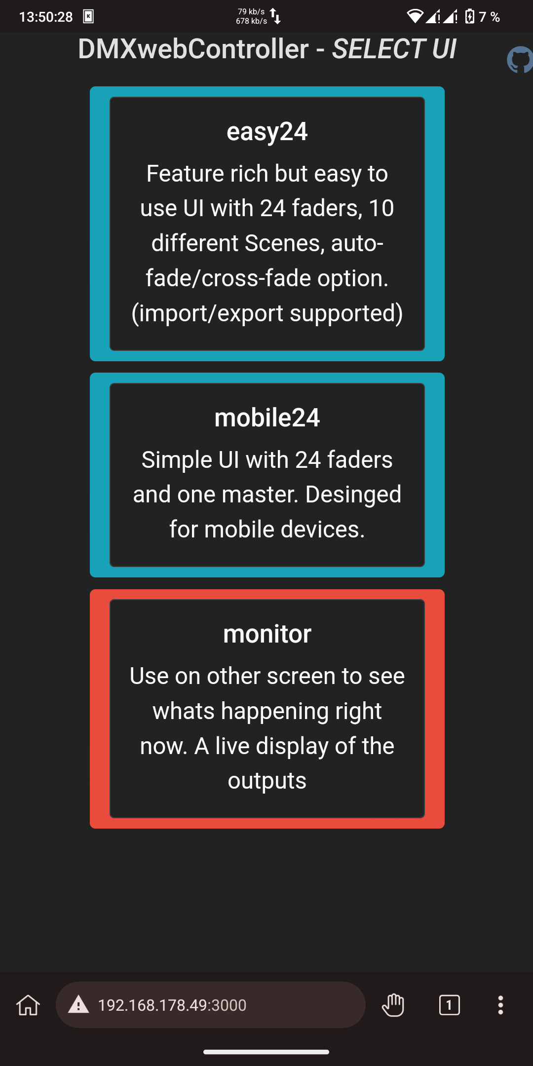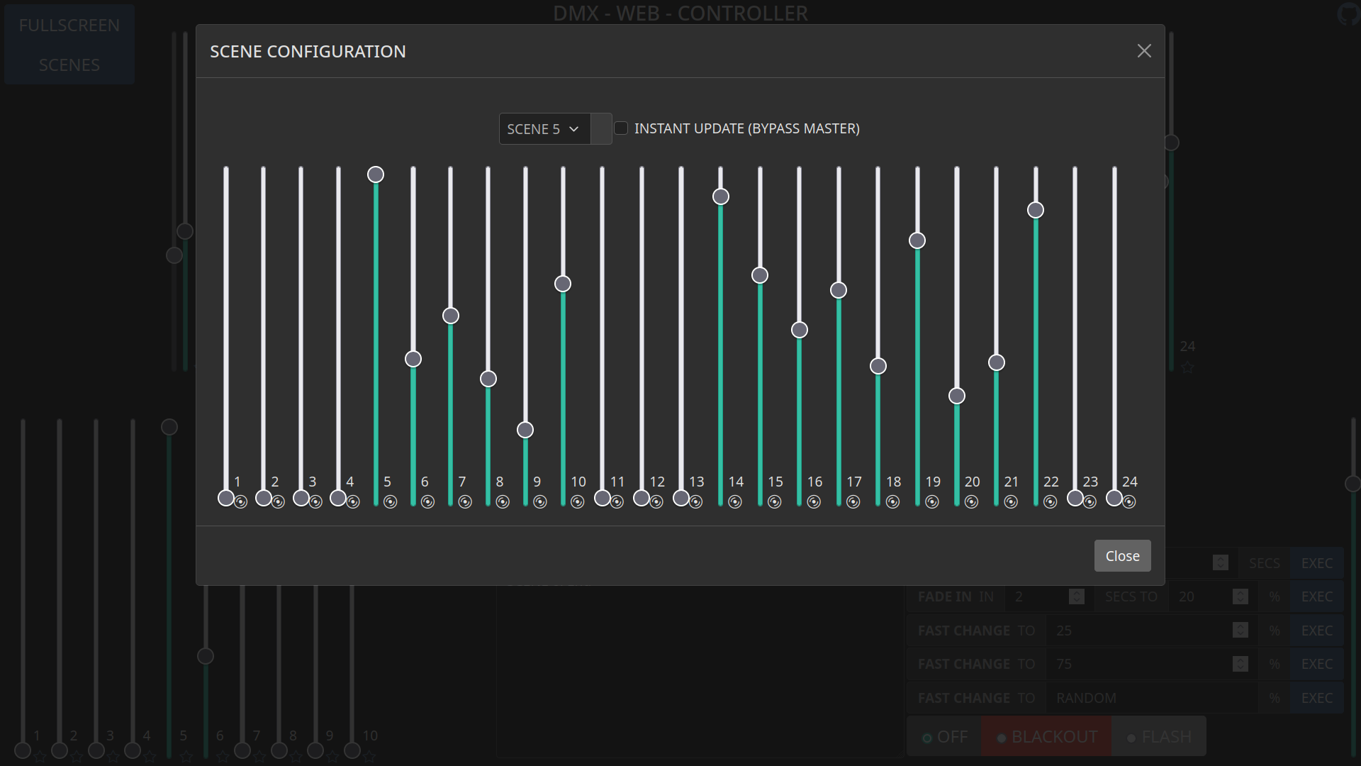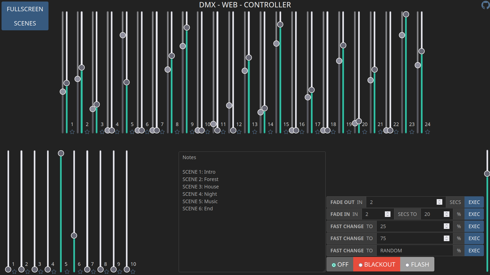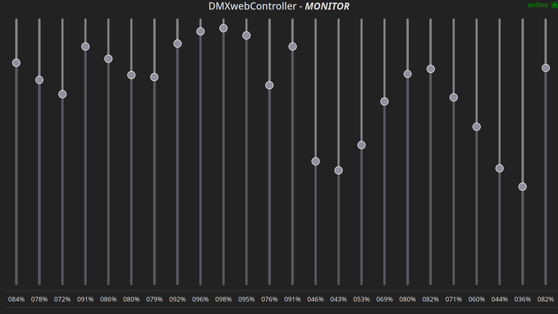 A simple web environment to simulate a lighting console and connect it to a Thinkerforge DMX Bricklet interface. Suitable for low end use. (theaters without special effects, speakers, …) The software is mainly desinged for my school lightning system, which does not offer some fancy RGB-lights etc. Therefore this system only supports 24 channels. The goal is to create a easy to understand UI for non teckies. (future project: make it scalable to use all 512 Channels)